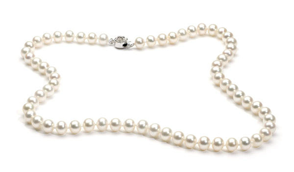 This 6-7 mm white freshwater necklace makes a beautiful, dainty statement. It is made from hand-selected, certified AAA pearls. AAA pearls exhibit excellent luster, are round or near round to the eye and considered virtually flawless (at least 95% defect free).